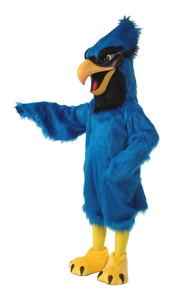 Cheer your team the Blue Jay way! This Blue Jay Mascot Costume is a great crowd pleaser, with a blue crest, feathery fur, and wing-style arms. Includes the head, body, yellow tights, and bird feet.