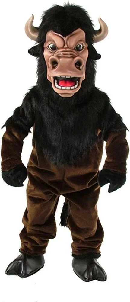 This tough Buffalo will fight for his team! Buffalo Mascot Costume includes the head with shaggy black fur, brown body, and hoof-style hands and feet.