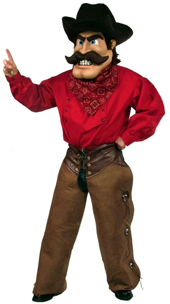 Ride off into the sunset with this heroic cowboy mascot costume. Costume includes the sculpted character head, hat, shirt, neckerchief, and chaps. Vision is out of the eyes which allows for a good field of sight. A good fit for middle schools, high schools, and colleges.