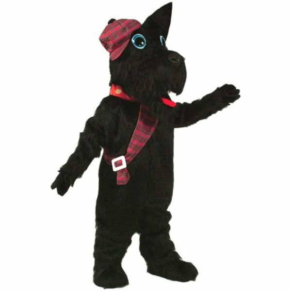 You should hear this Scotty Dog play the bagpipes! Scotty Dog Mascot Costume has shaggy black fur and is dressed in a collar, hat, and matching sash. Includes the head, body, hands, and feet. Vision is through the mouth.