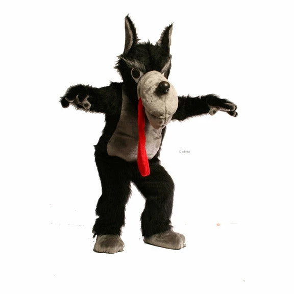 He’s big! He’s bad! He’s black and gray! This complete wolf mascot costume includes the head, body with padded tummy, mitts and jumbo oversize feet. Vision is through the mouth.