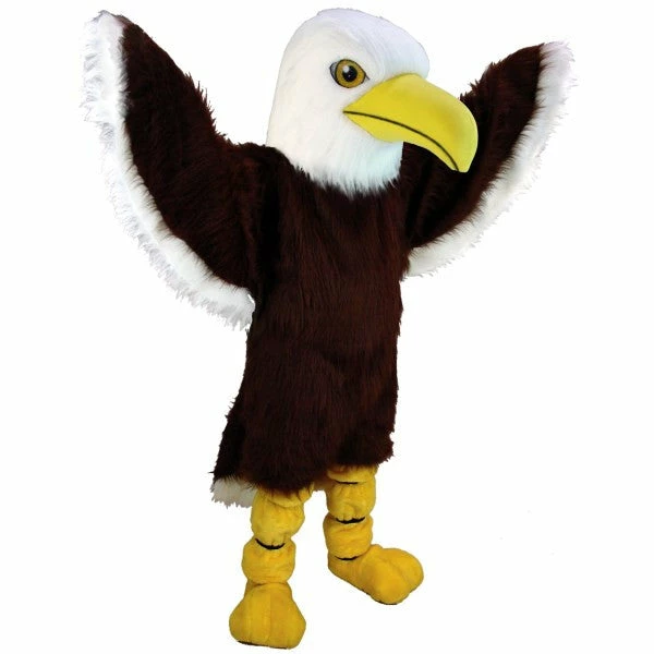 Let your patriotic spirit soar to new heights in this American Bald Eagle mascot costume! Lightweight American Eagle Mascot Costume has a white head and feathery brown fur with white accents, a yellow beak, and yellow bird Feet. Comes complete with head, body, hands and Feet.