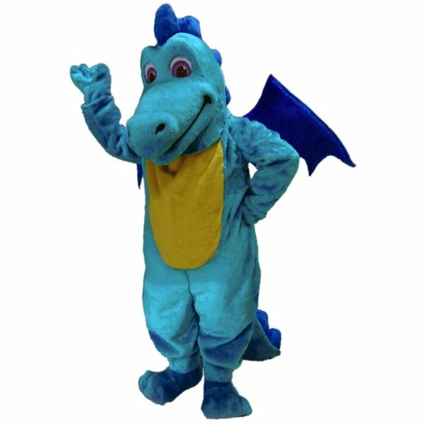 Capture the imagination in this friendly Turquoise Dragon Mascot Costume! Features a turquoise body with yellow tummy and blue spikes down his back and tail, plus a pair of blue wings. Comes complete with head, body, hands and Feet.