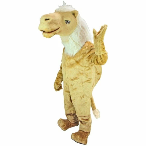 Don’t sweat the desert sun in this Camel Mascot Costume! Features sandy brown fur with a white mane and a friendly face, and a hump on his back. Comes complete with head, body, hands and Feet.