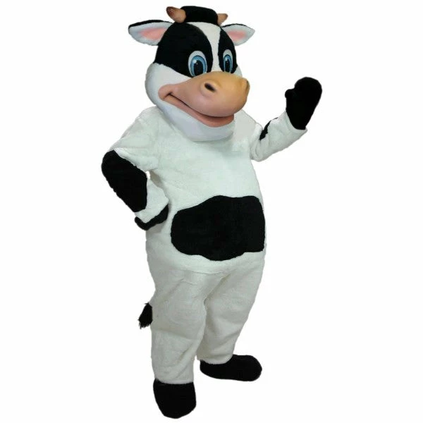 This gentle cow comes from the friendliest farm around! Betsy the Cow Mascot Costume has a friendly face and is white spotted with black in the Holstein pattern. Comes complete with head, body, hands and Feet.