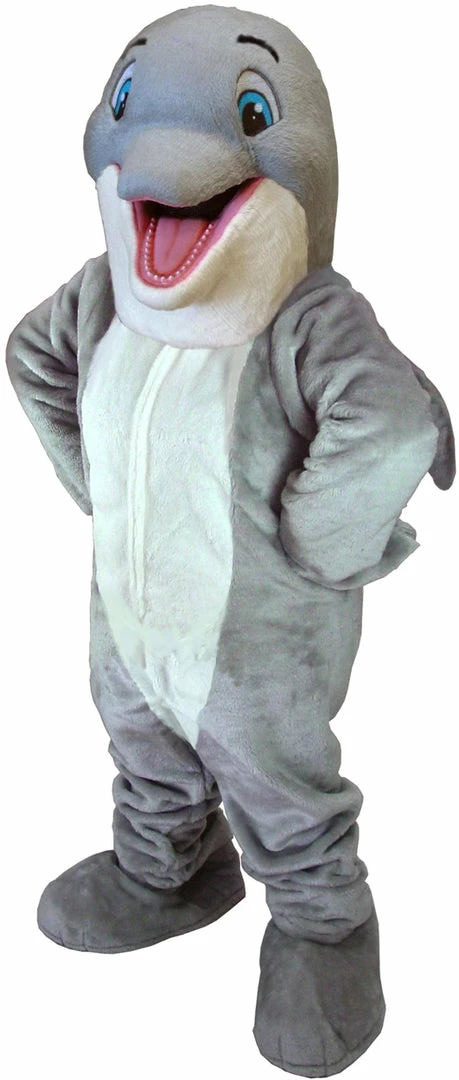 This cheerful dolphin mascot will make you feel like doing flips for joy! Happy Dolphin Mascot is gray with a white underbelly and has a friendly face with bright blue eyes. Comes complete with head, body, hands and Feet.