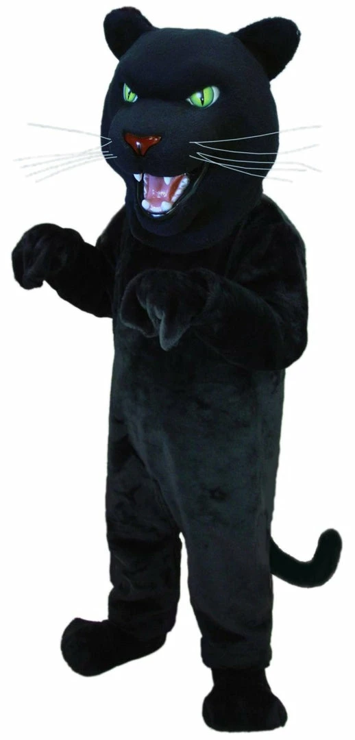 Pounce out of the shadows in this Black Panther Mascot Costume! Panther Mascot Costume has velvety back fur and a fiercely roaring face with bright green eyes. Comes complete with head, body, hands and Feet.