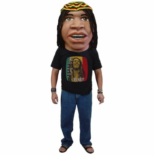 This Rasta Man Mascot Head has dreadlocks, a Rastafarian-style Tam hat with colorful stripes, and a comical face. Includes the head only.Â