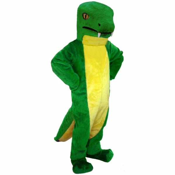 Slither to success in this stunning snake mascot costume! This Snake Lightweight Mascot Costume has a green body with yellow underbelly, suspended tail, and face with fangs. Comes complete with head, body, hands and Feet.