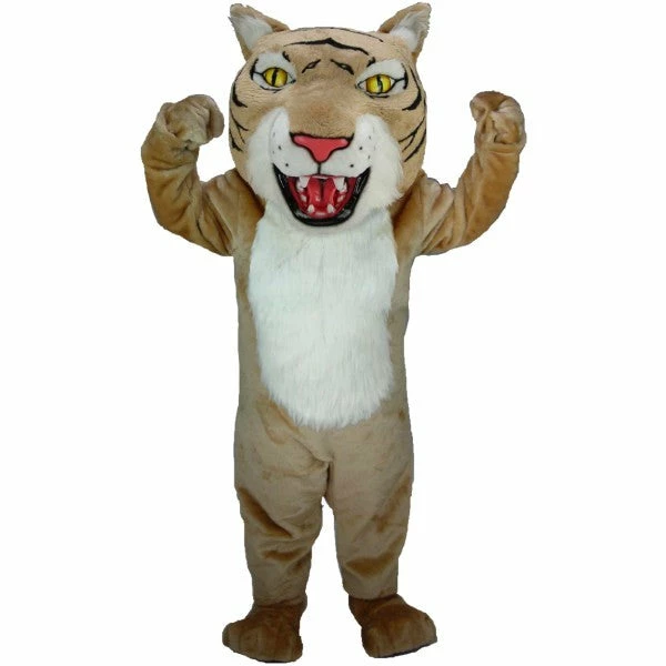 Let this Tan Wildcat fire up the bleachers at your next sporting event! This Tan Wildcat lightweight mascot costume has a head constructed out of vacuum-formed styrene to keep it light and cool for the wearer. Features tan-colored fur with black stripes, a fierce expression, and a fluffy white tummy. Comes complete with head, body, hands and Feet.